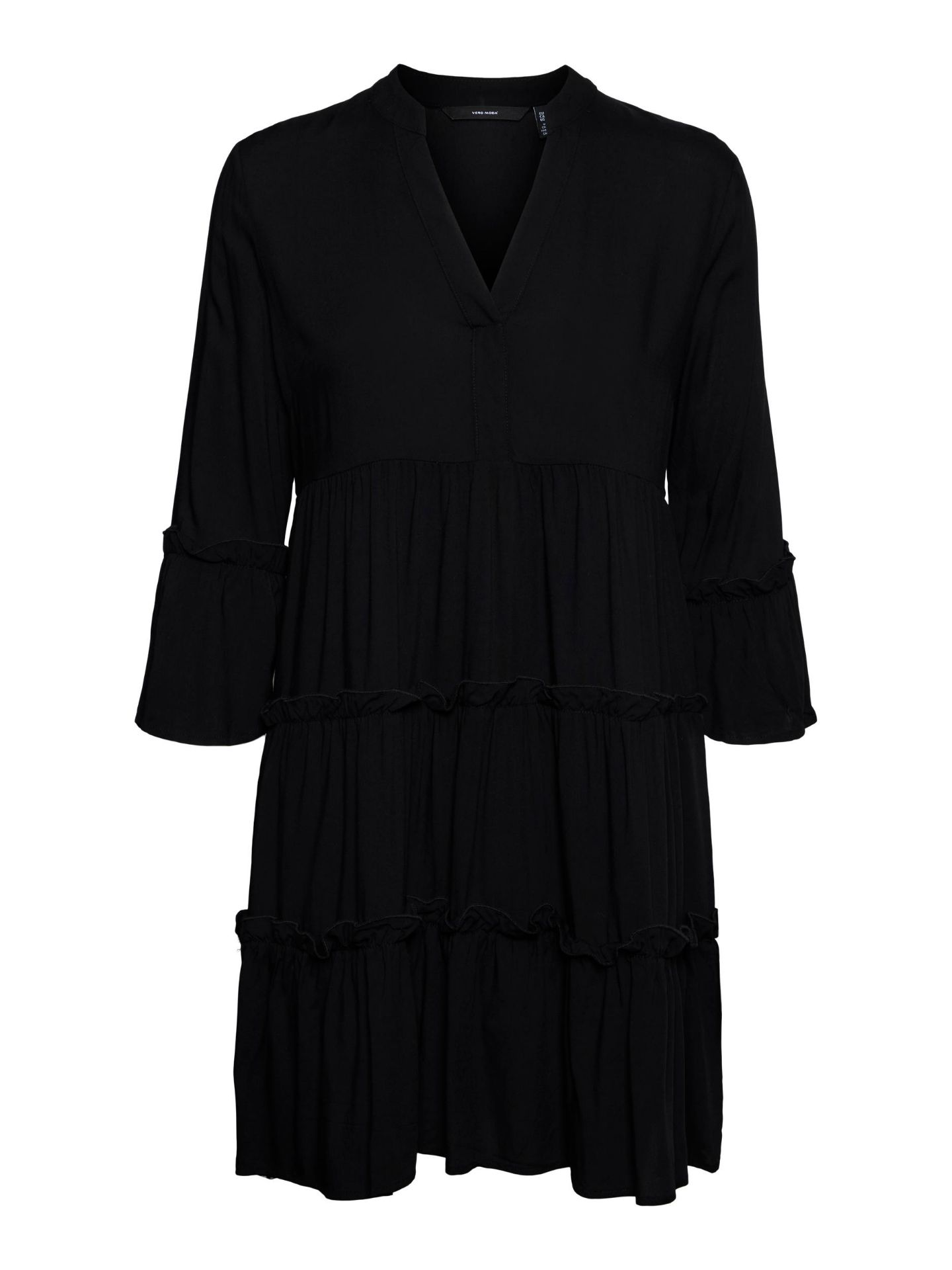 Short summer dress with flounces, wide 3/4 sleeve, V-neck with ruffles in a light viscose fabric. Although it is a short dress, it is made in extra long for the tall woman, so that the length and proportions are also right for us. The mini dress is available in classic black and in black printed with flowers.