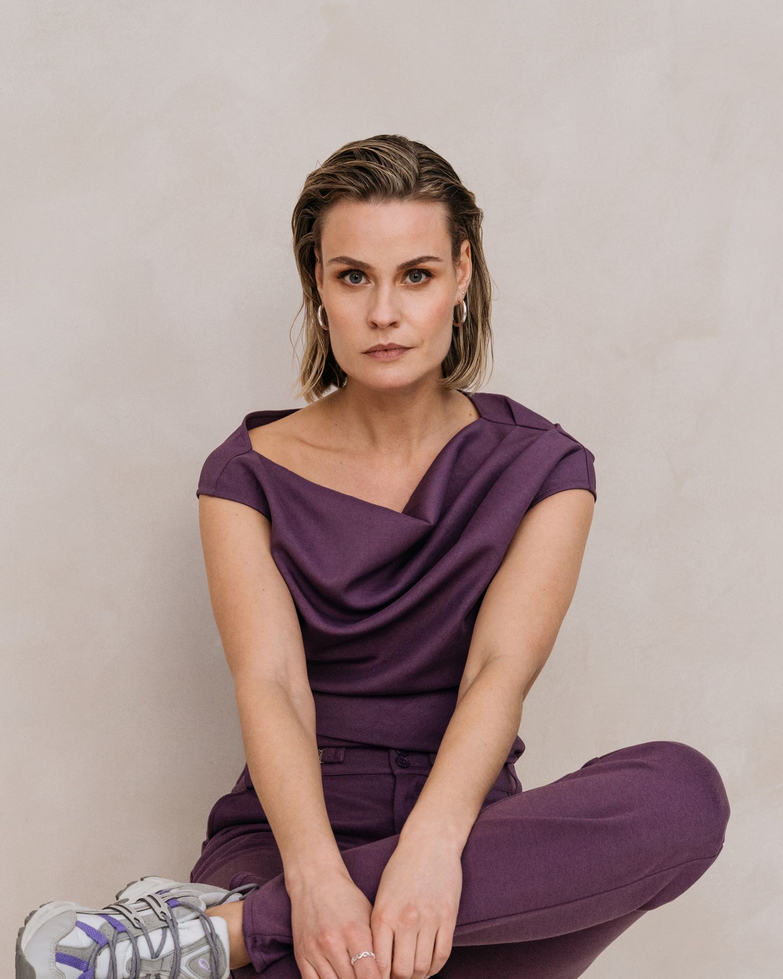 A beautiful colour for autumn – this short-sleeved top with a draped neckline is the perfect companion under jackets and blazers.