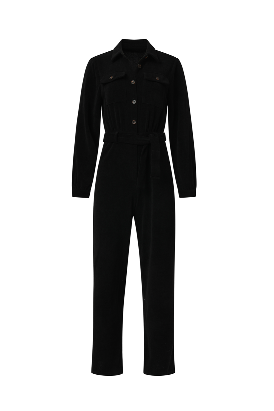 Combinaison noire de Smashed Lemon, confectionnée en velours côtelé doux, avec un col chemise classique, des manches longues et une fermeture à boutons sur la poitrine. Les jambes larges et évasées créent une silhouette flatteuse, confortable et élégante. Sa couleur noire profonde en fait un choix polyvalent, aussi bien pour les tenues de tous les jours que pour les occasions plus habillées. À porter avec des bottes ou des talons et à accessoiriser d'une ceinture pour souligner la taille. Caractéristiques principales : - Velours côtelé noir avec une structure côtelée raffinée - Modèle chemise avec col et boutons pour une touche classique - Jambes évasées pour un look élégant et féminin - Manches longues, idéales pour les journées plus fraîches